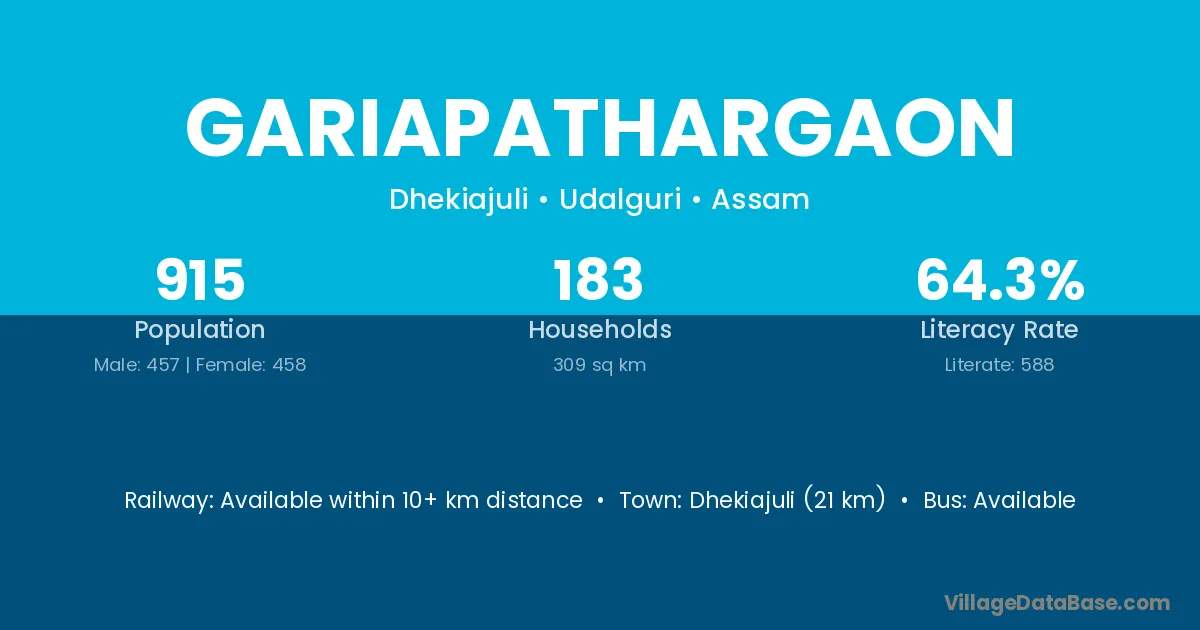 Dhekiajuli (21 km) is the nearest town to Gariapathargaon village for major economic activities and is located approximately 21 km away.