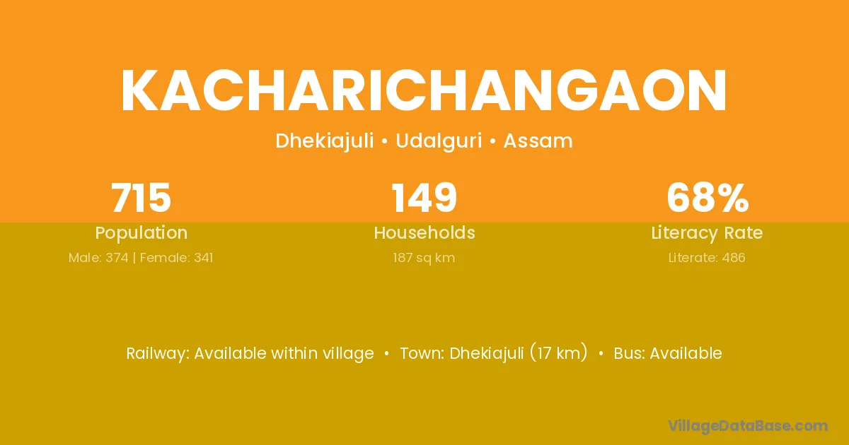 Dhekiajuli (17 km) is the nearest town to Kacharichangaon village for major economic activities and is located approximately 17 km away.
