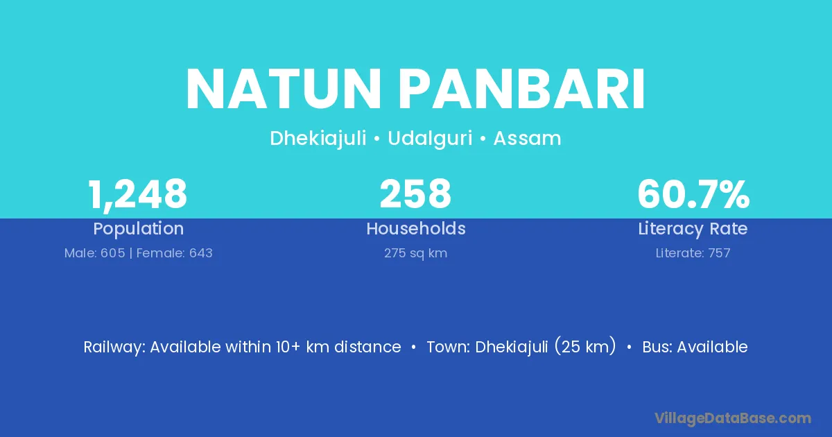 Natun Panbari village has a total population of 1,248 people, of which 605 are males and 643 are females.