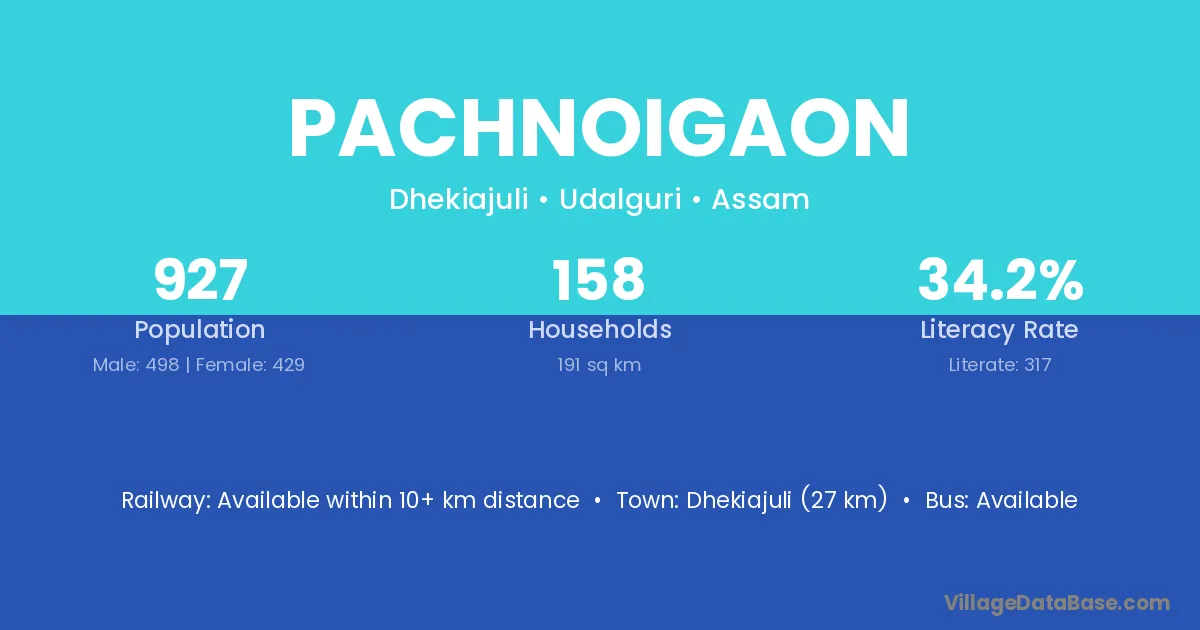 Dhekiajuli (27 km) is the nearest town to Pachnoigaon village for major economic activities and is located approximately 27 km away.