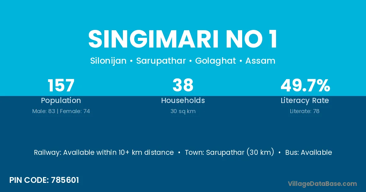 Dhekiajuli (18 km) is the nearest town to Singimari No 1 village for major economic activities and is located approximately 18 km away.