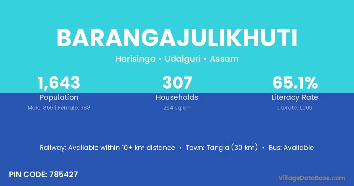 Tangla (30 km) is the nearest town to Barangajulikhuti village for major economic activities and is located approximately 30 km away.