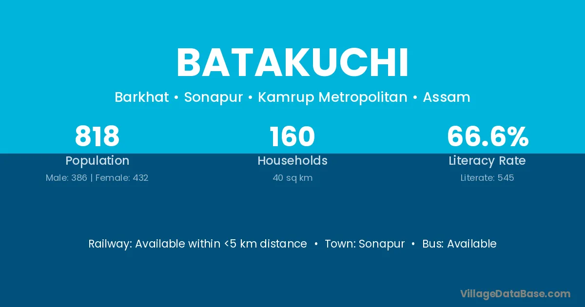 The literacy rate of Batakuchi village is 68.07%. Male literacy stands at 78.14% and female literacy at 57.62%.