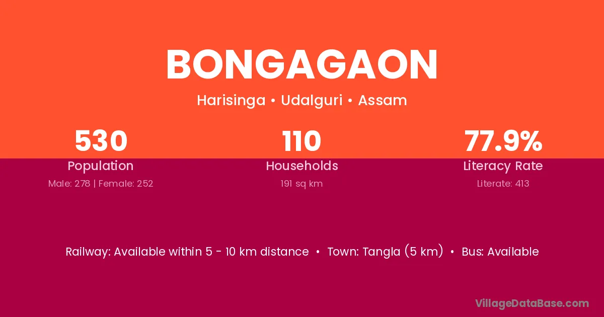 Tangla (5 km) is the nearest town to Bongagaon village for major economic activities and is located approximately 5 km away.