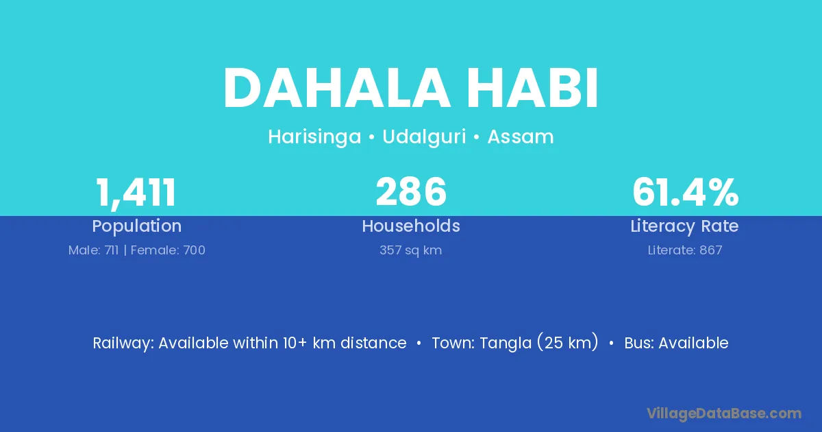 Tangla (25 km) is the nearest town to Dahala Habi village for major economic activities and is located approximately 25 km away.