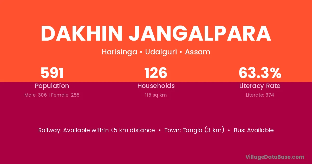 Tangla (3 km) is the nearest town to Dakhin Jangalpara village for major economic activities and is located approximately 3 km away.