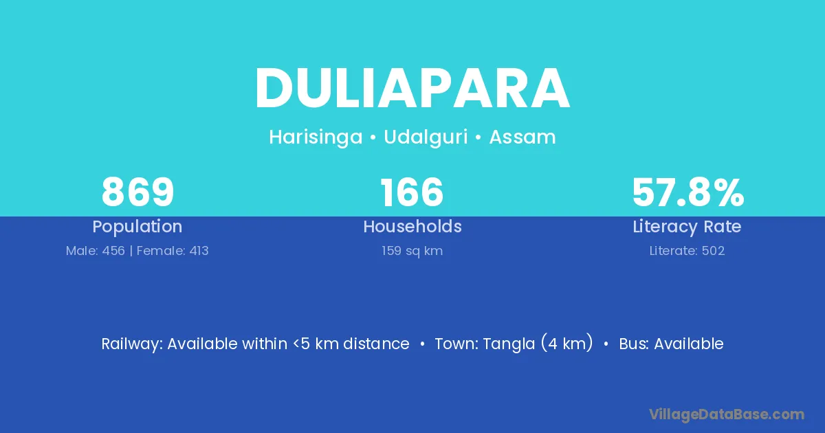 Duliapara village has a total population of 869 people, of which 456 are males and 413 are females.