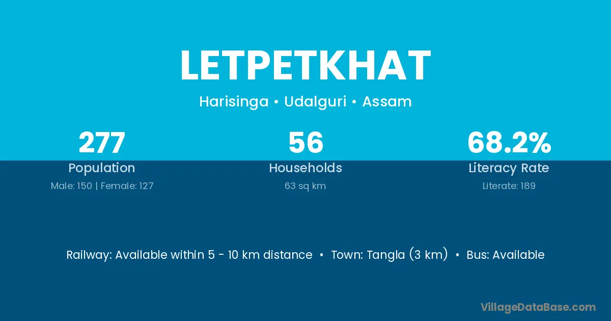 Tangla (3 km) is the nearest town to Letpetkhat village for major economic activities and is located approximately 3 km away.