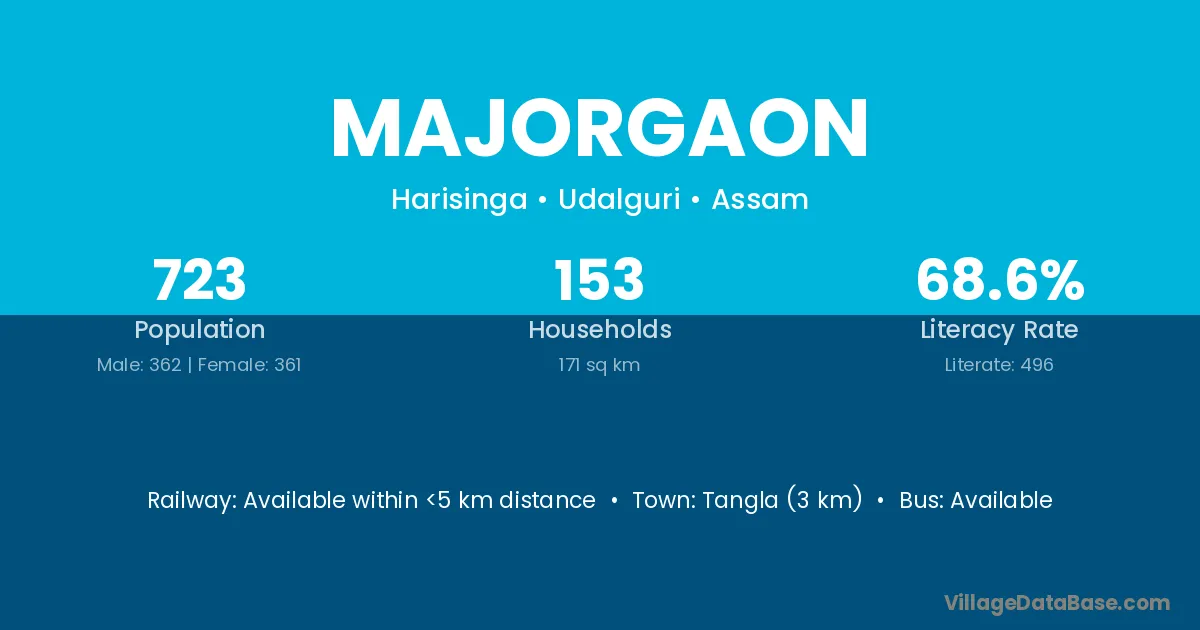 Tangla (3 km) is the nearest town to Majorgaon village for major economic activities and is located approximately 3 km away.