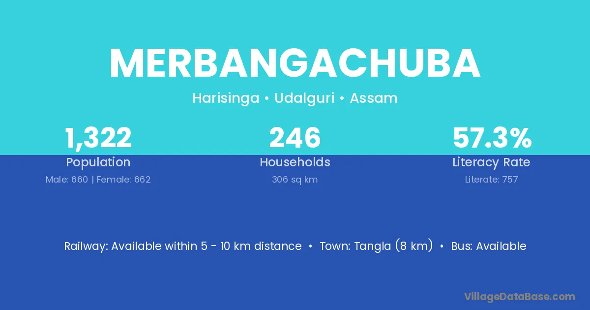 Merbangachuba village has a total population of 1,322 people, of which 660 are males and 662 are females.