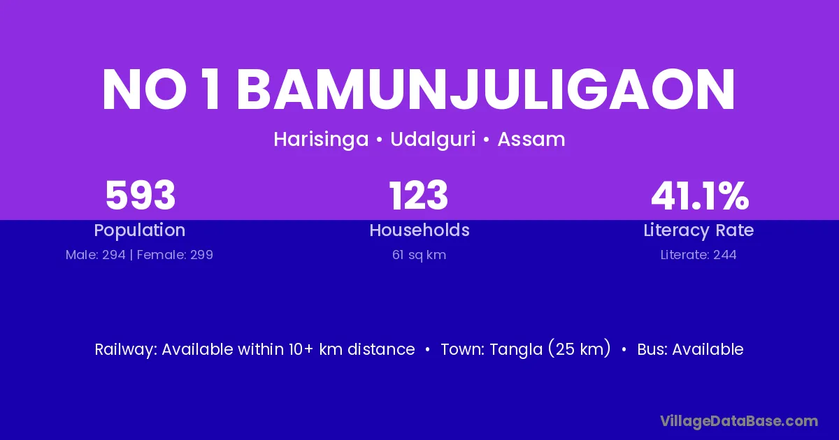 No 1 Bamunjuligaon village has a total population of 593 people, of which 294 are males and 299 are females.