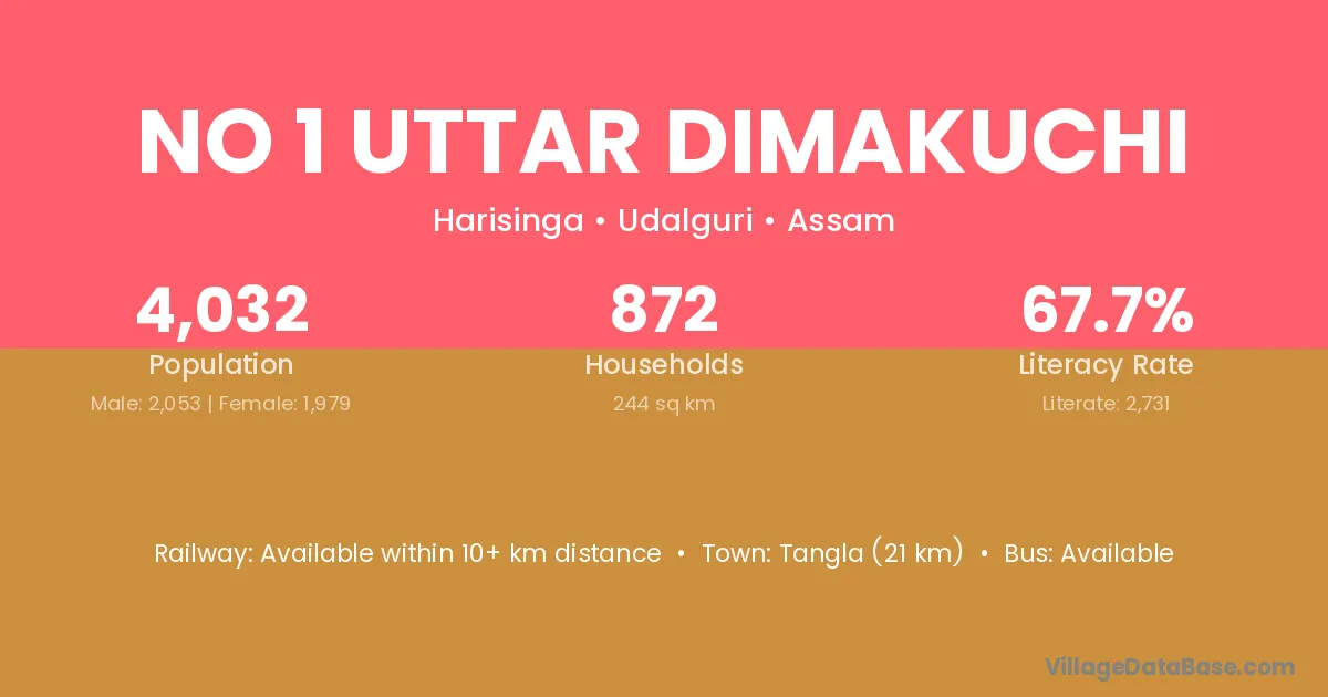 No 1 Uttar Dimakuchi village has a total population of 4,032 people, of which 2,053 are males and 1,979 are females.