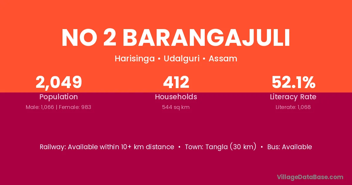 No 2 Barangajuli village has a total population of 2,049 people, of which 1,066 are males and 983 are females.