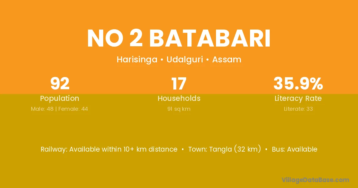 No 2 Batabari village has a total population of 92 people, of which 48 are males and 44 are females.