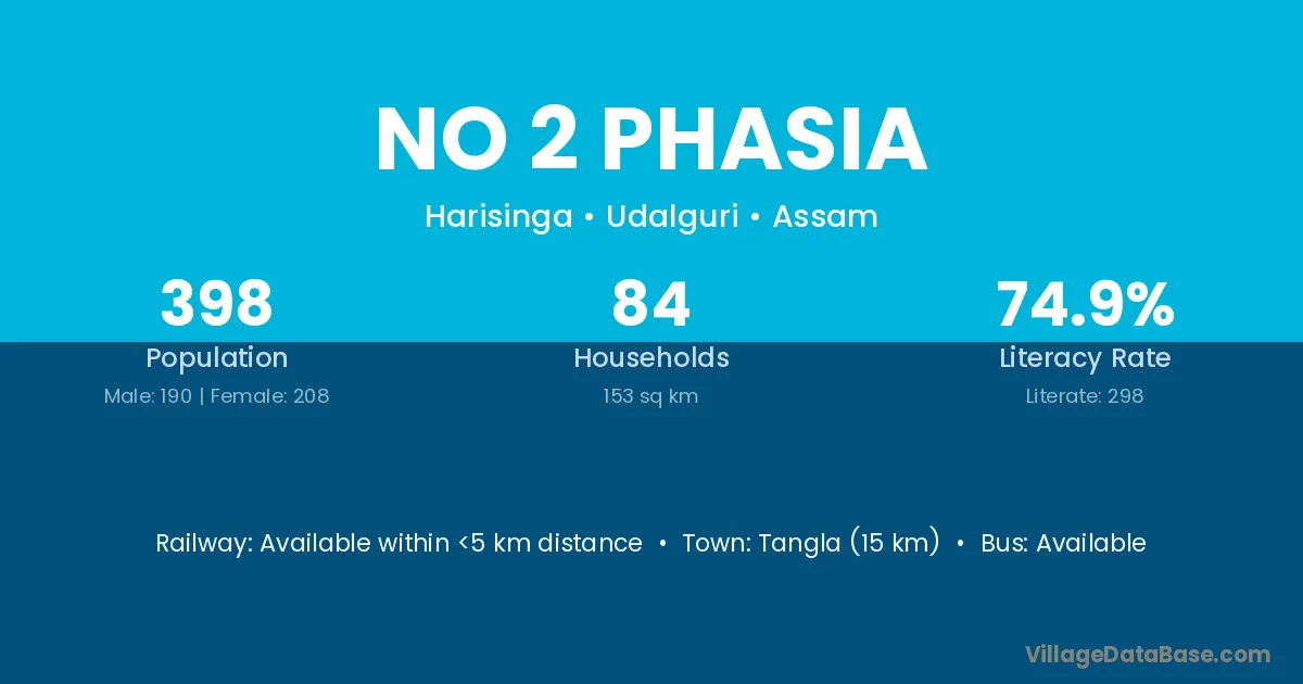No 2 Phasia village has a total population of 398 people, of which 190 are males and 208 are females.