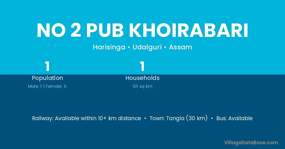 No 2 Pub Khoirabari village has a total population of 1 people, of which 1 are males and 0 are females.