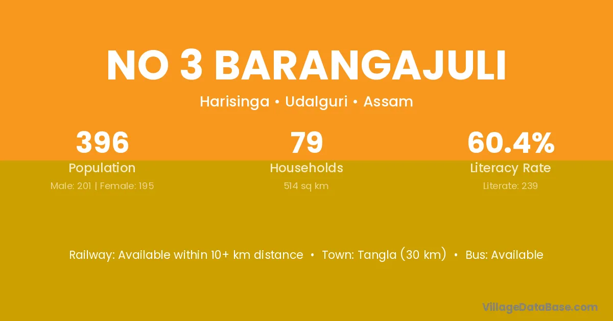No 3 Barangajuli village has a total population of 396 people, of which 201 are males and 195 are females.