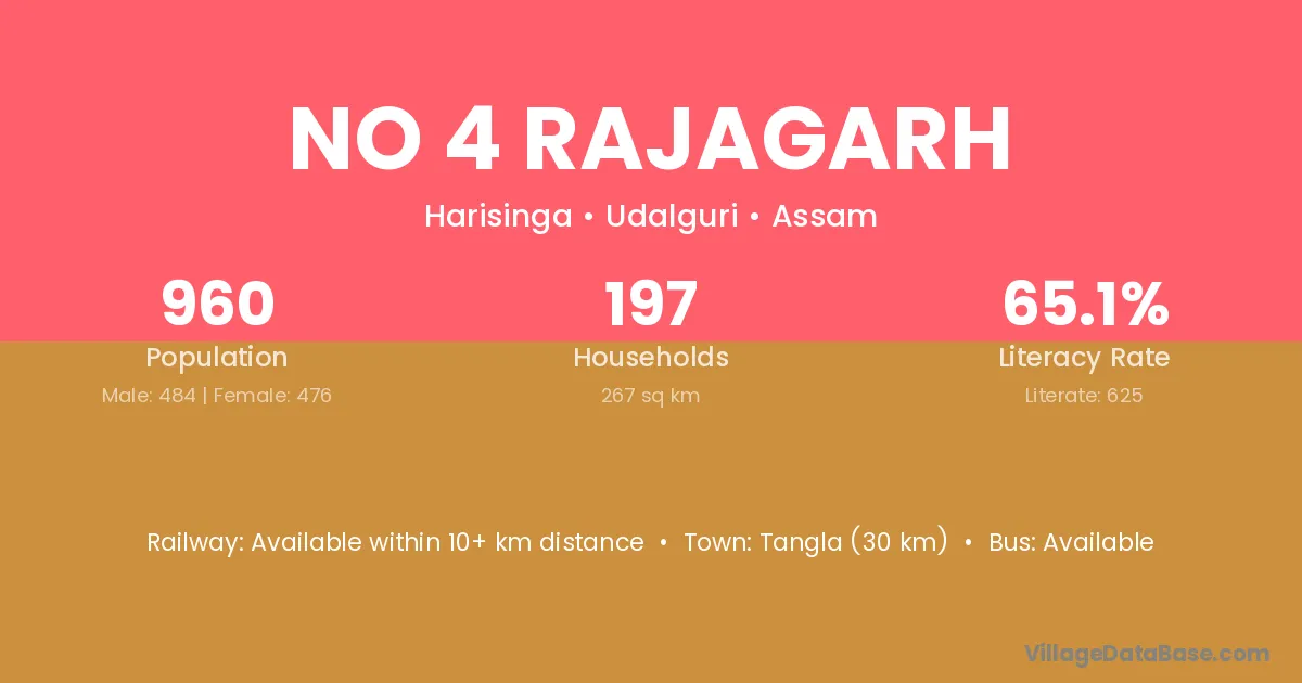 Tangla (30 km) is the nearest town to No 4 Rajagarh village for major economic activities and is located approximately 30 km away.