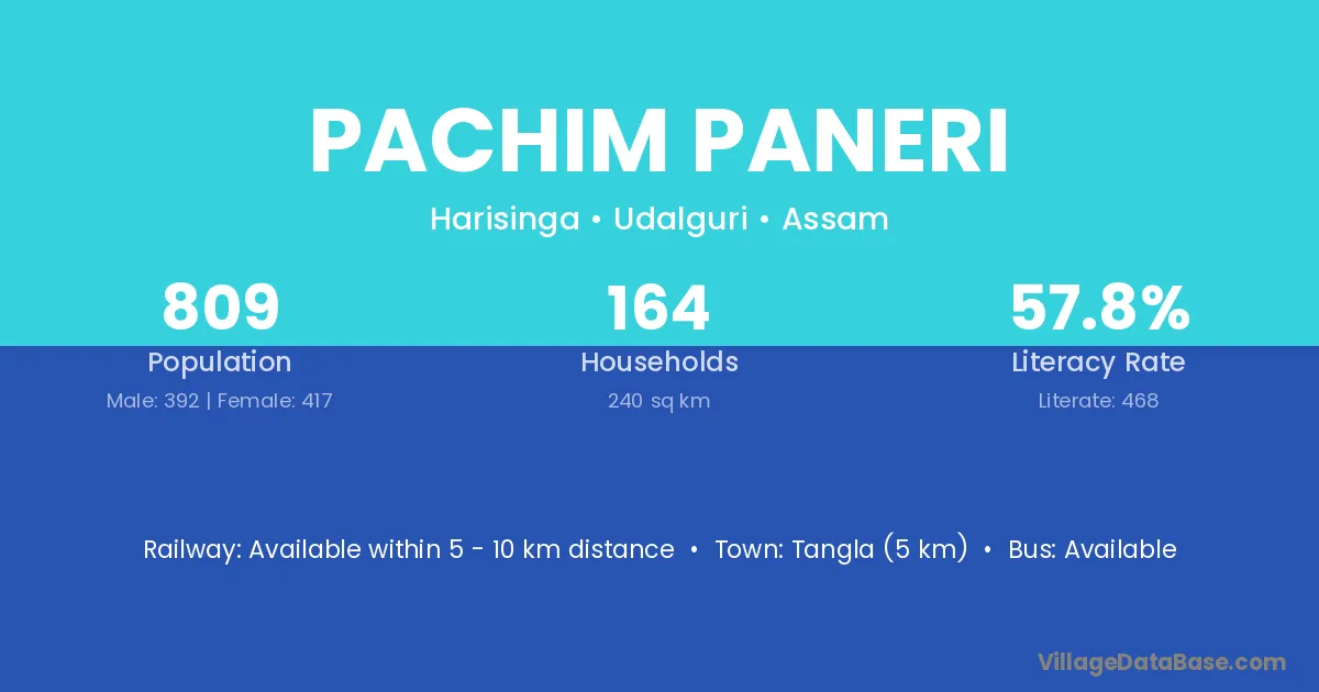 Tangla (5 km) is the nearest town to Pachim Paneri village for major economic activities and is located approximately 5 km away.