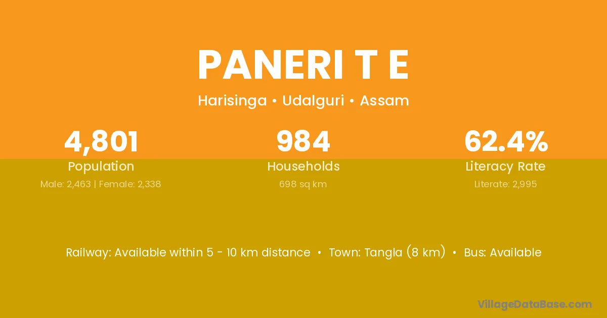 Tangla (8 km) is the nearest town to Paneri T E village for major economic activities and is located approximately 8 km away.