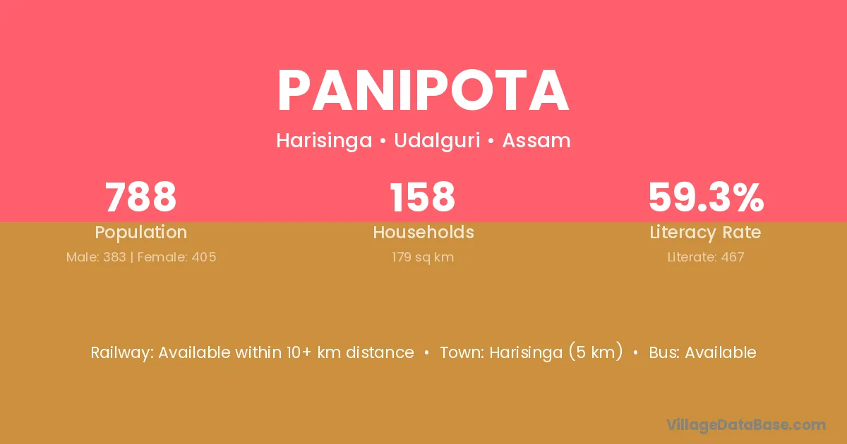 Harisinga (5 km) is the nearest town to Panipota village for major economic activities and is located approximately 5 km away.