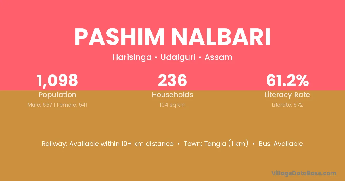 Tangla (1 km) is the nearest town to Pashim Nalbari village for major economic activities and is located approximately 1 km away.