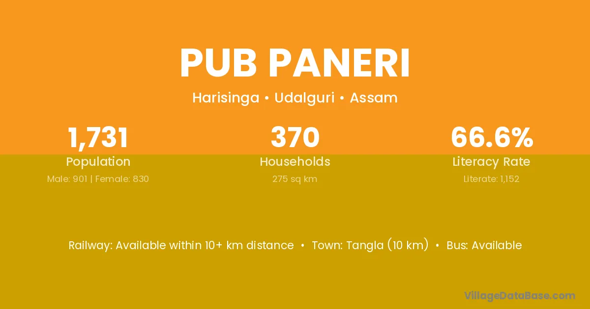 Pub Paneri village has a total population of 1,731 people, of which 901 are males and 830 are females.