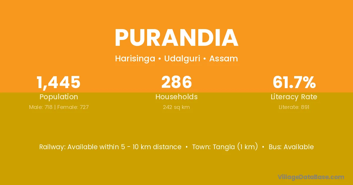 Tangla (1 km) is the nearest town to Purandia village for major economic activities and is located approximately 1 km away.