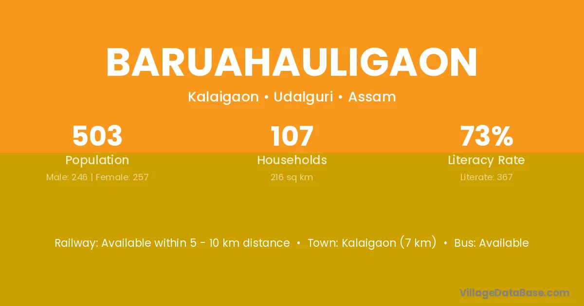 Baruahauligaon village has a total population of 503 people, of which 246 are males and 257 are females.