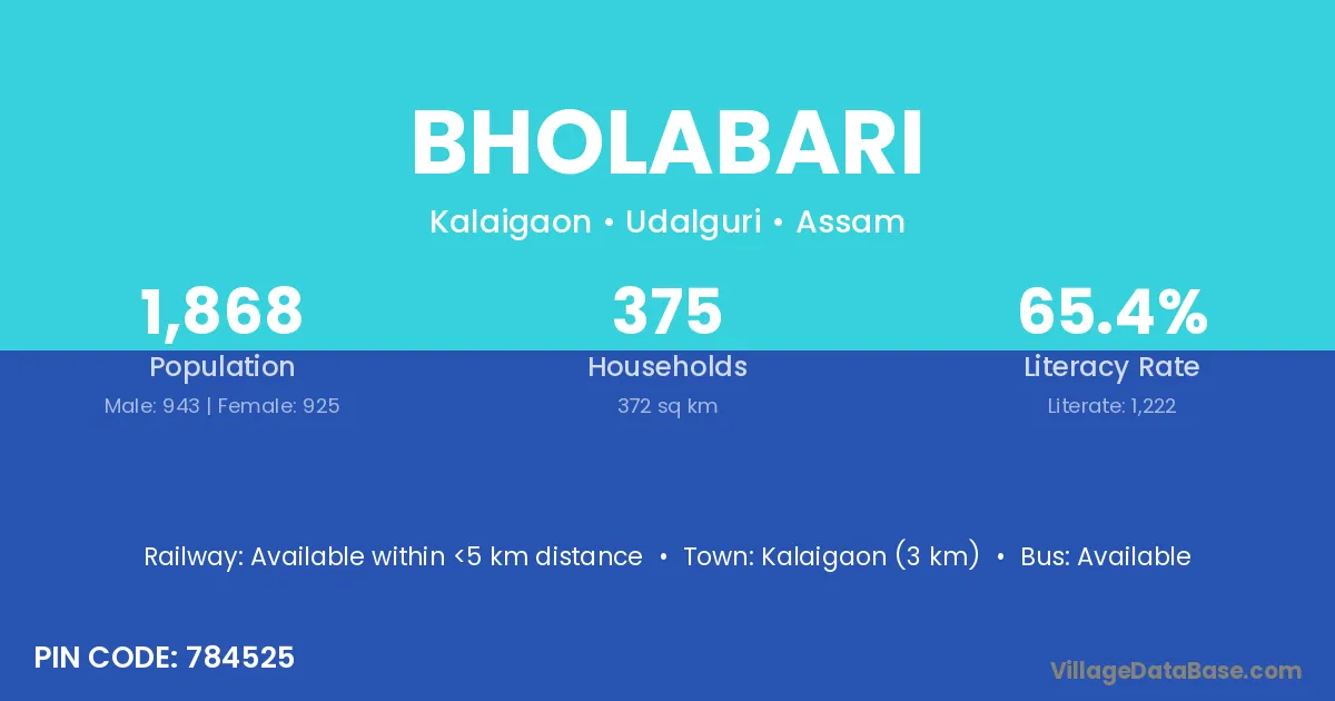 Kalaigaon (3 km) is the nearest town to Bholabari village for major economic activities and is located approximately 3 km away.