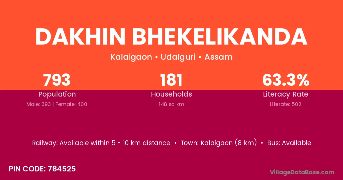 Kalaigaon (8 km) is the nearest town to Dakhin Bhekelikanda village for major economic activities and is located approximately 8 km away.
