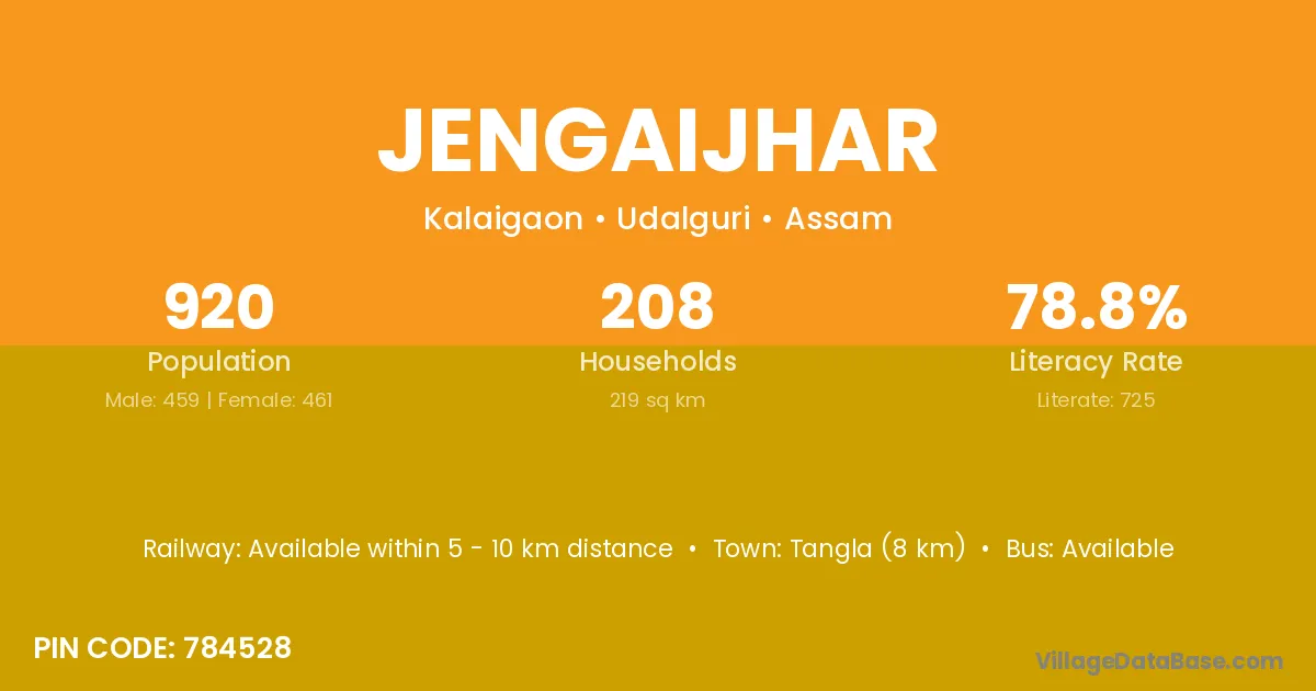 Tangla (8 km) is the nearest town to Jengaijhar village for major economic activities and is located approximately 8 km away.