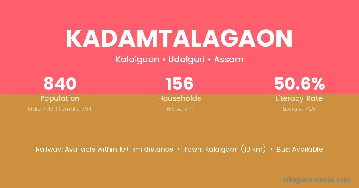 Kadamtalagaon village has a total population of 840 people, of which 446 are males and 394 are females.