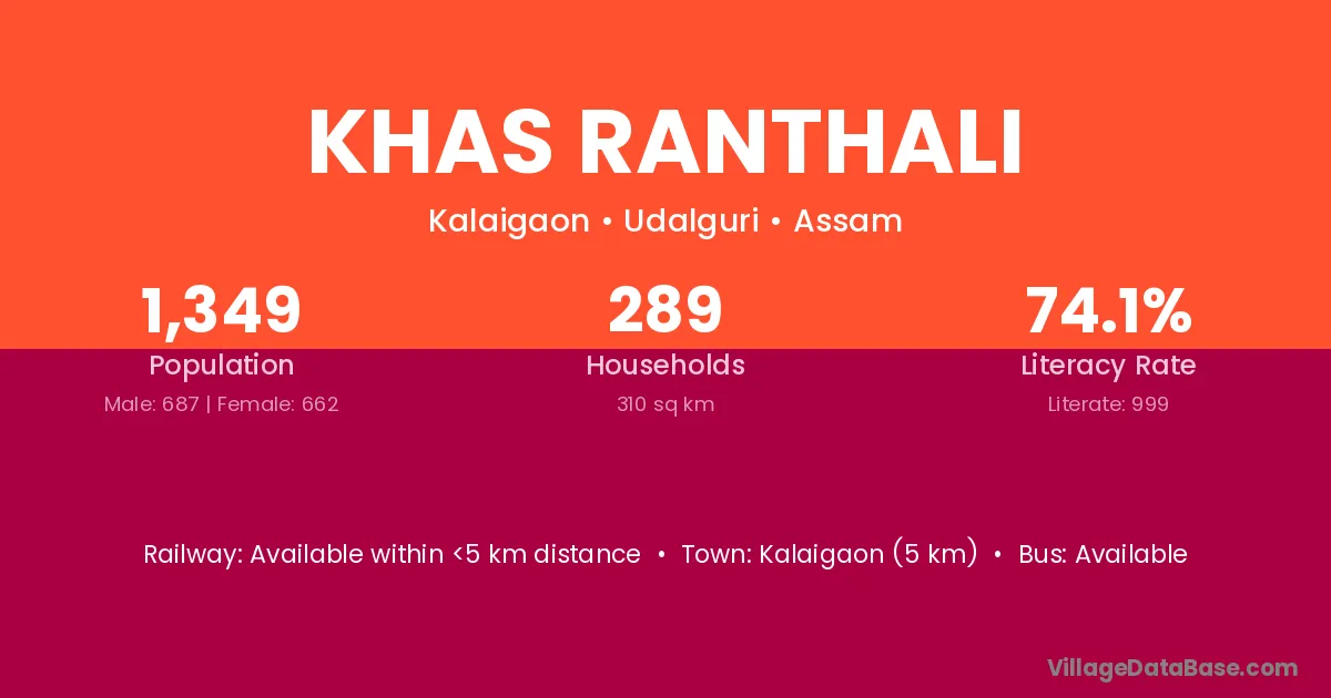 Kalaigaon (5 km) is the nearest town to Khas Ranthali village for major economic activities and is located approximately 5 km away.