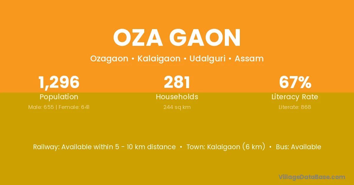 Kalaigaon (6 km) is the nearest town to Oza Gaon village for major economic activities and is located approximately 6 km away.