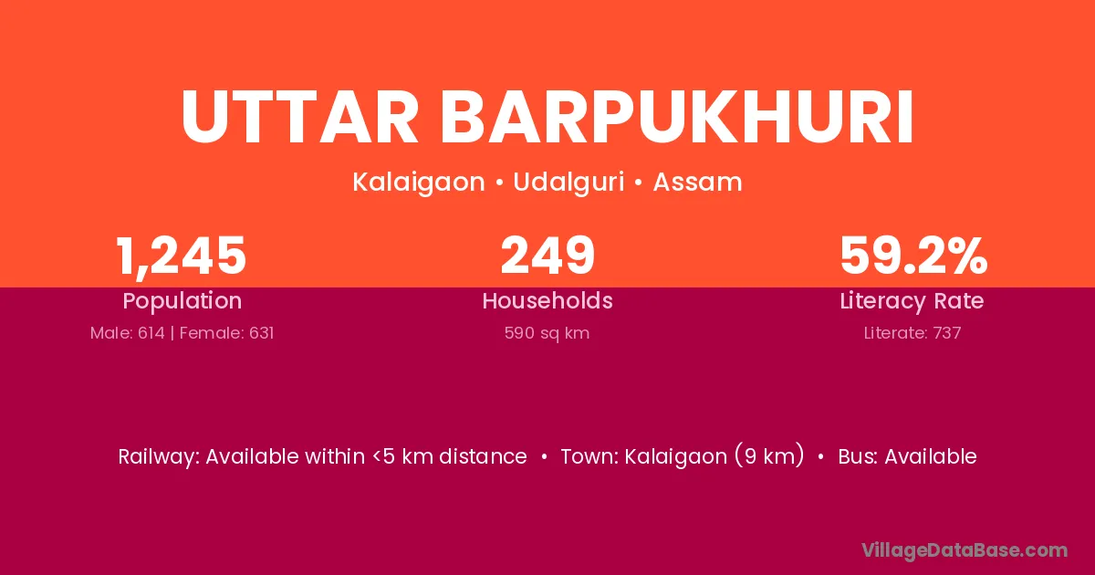 Uttar Barpukhuri village has a total population of 1,245 people, of which 614 are males and 631 are females.