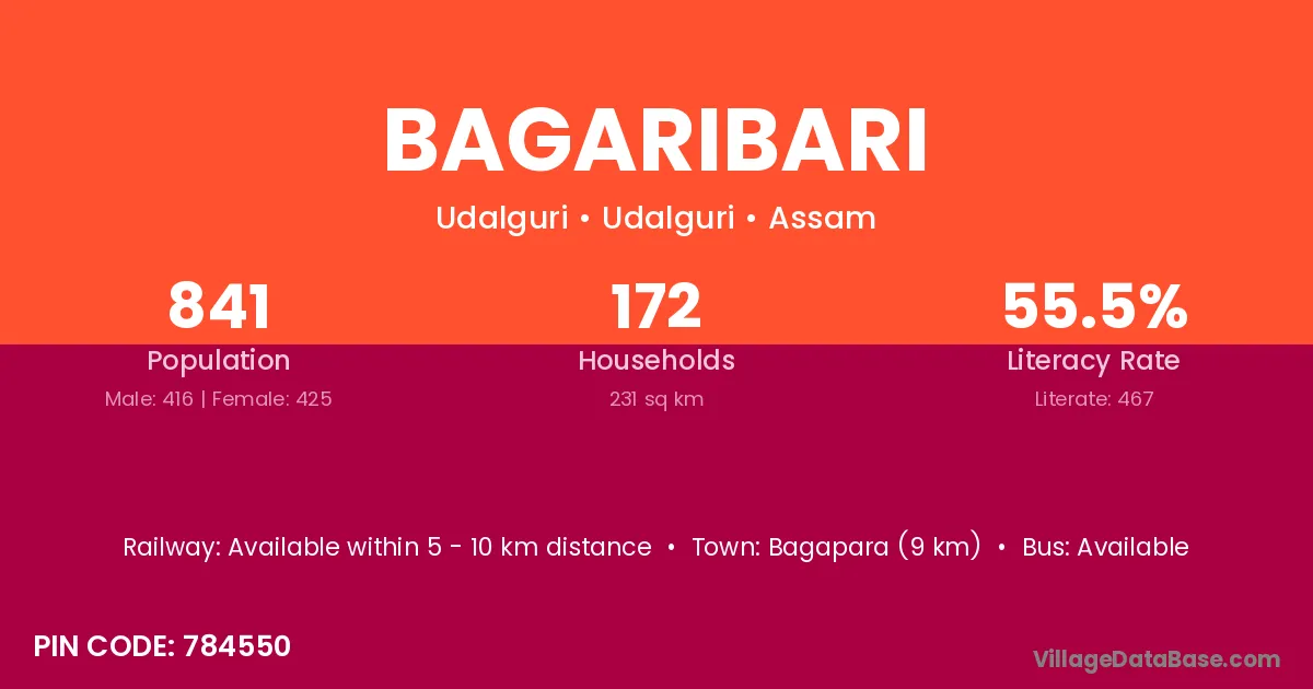 Tangla (30 km) is the nearest town to Bagaribari village for major economic activities and is located approximately 30 km away.