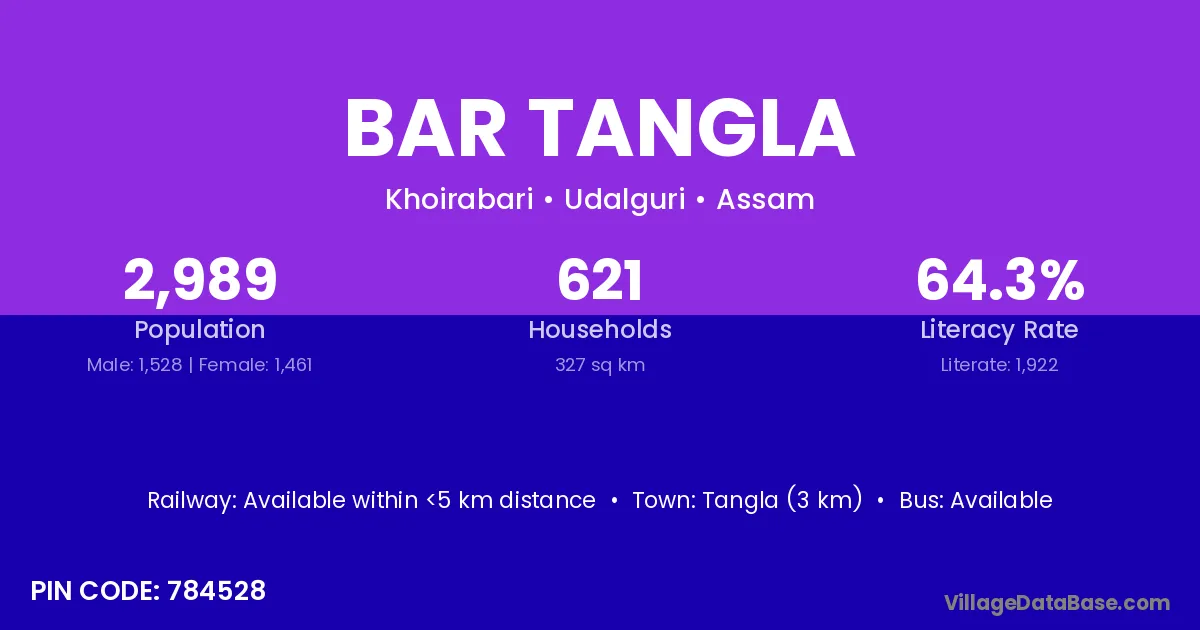 Bar Tangla village has a total population of 2,989 people, of which 1,528 are males and 1,461 are females.