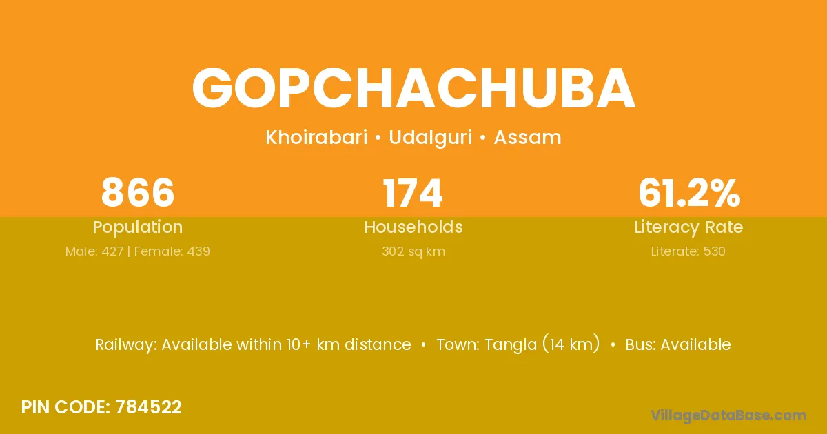Tangla (14 km) is the nearest town to Gopchachuba village for major economic activities and is located approximately 14 km away.