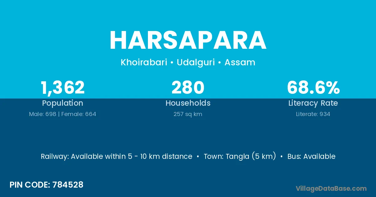 Tangla (5 km) is the nearest town to Harsapara village for major economic activities and is located approximately 5 km away.