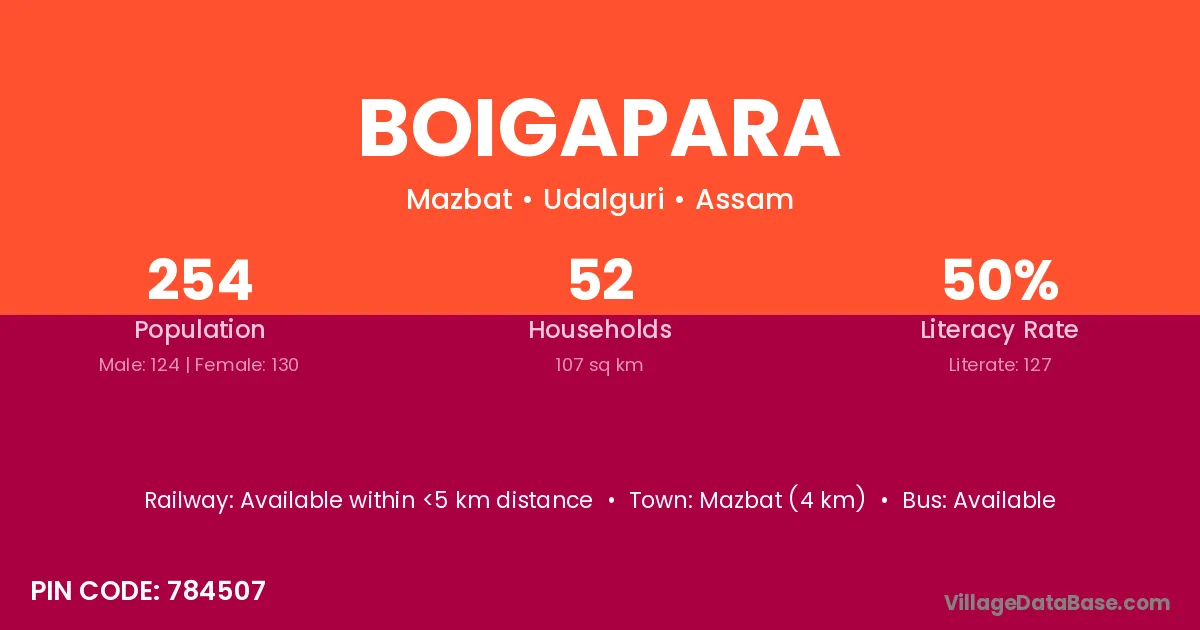 Mazbat (4 km) is the nearest town to Boigapara village for major economic activities and is located approximately 4 km away.