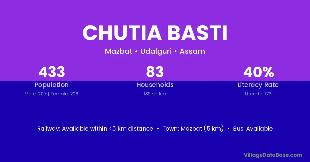 Chutia Basti village has a total population of 433 people, of which 207 are males and 226 are females.