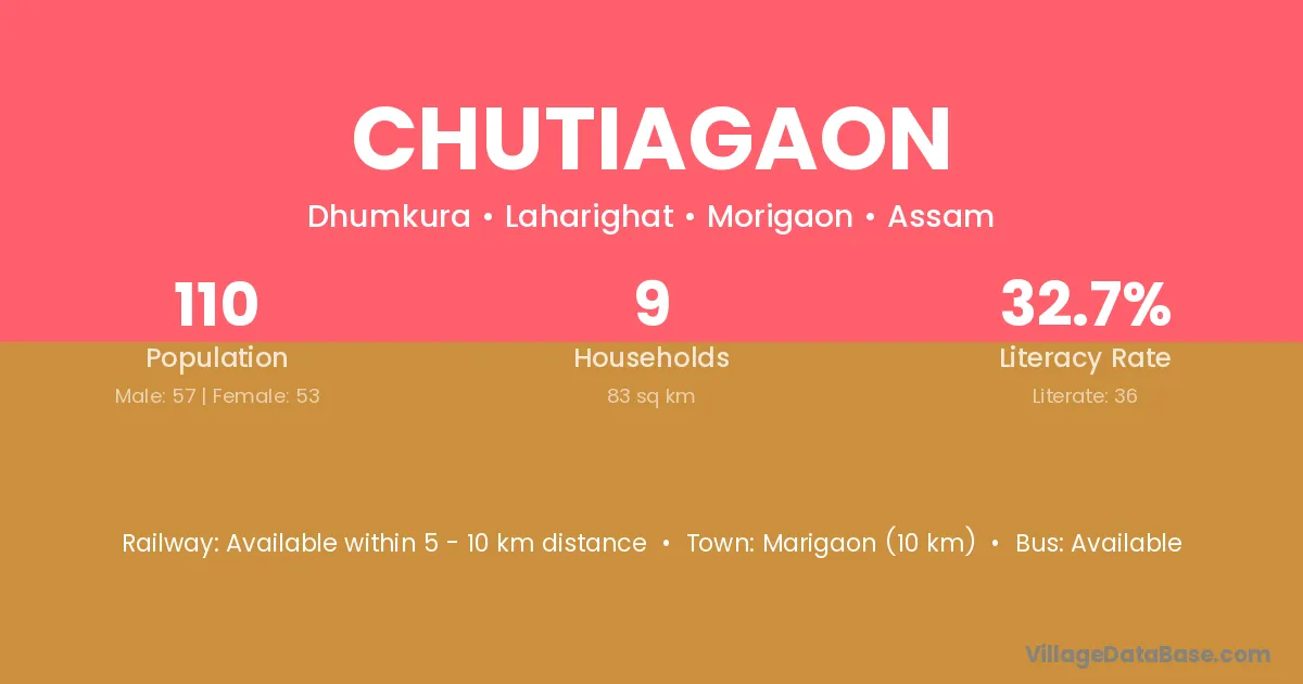 Chutiagaon village has a total population of 694 people, of which 352 are males and 342 are females.