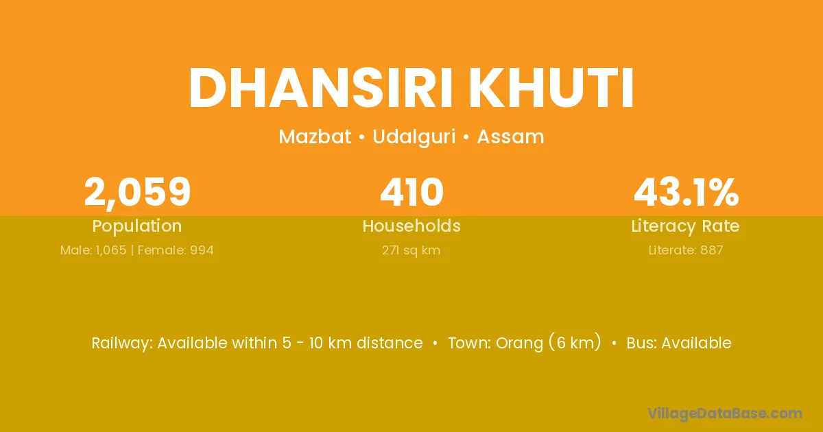 Orang (6 km) is the nearest town to Dhansiri Khuti village for major economic activities and is located approximately 6 km away.