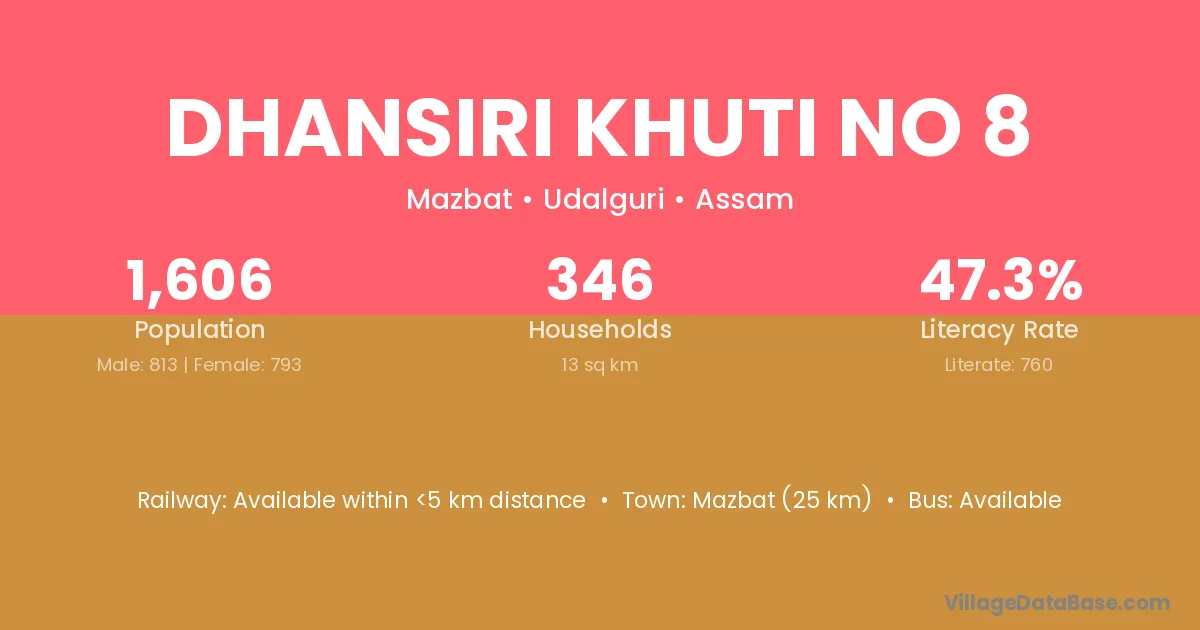 Dhansiri Khuti No 8 village has a total population of 1,606 people, of which 813 are males and 793 are females.