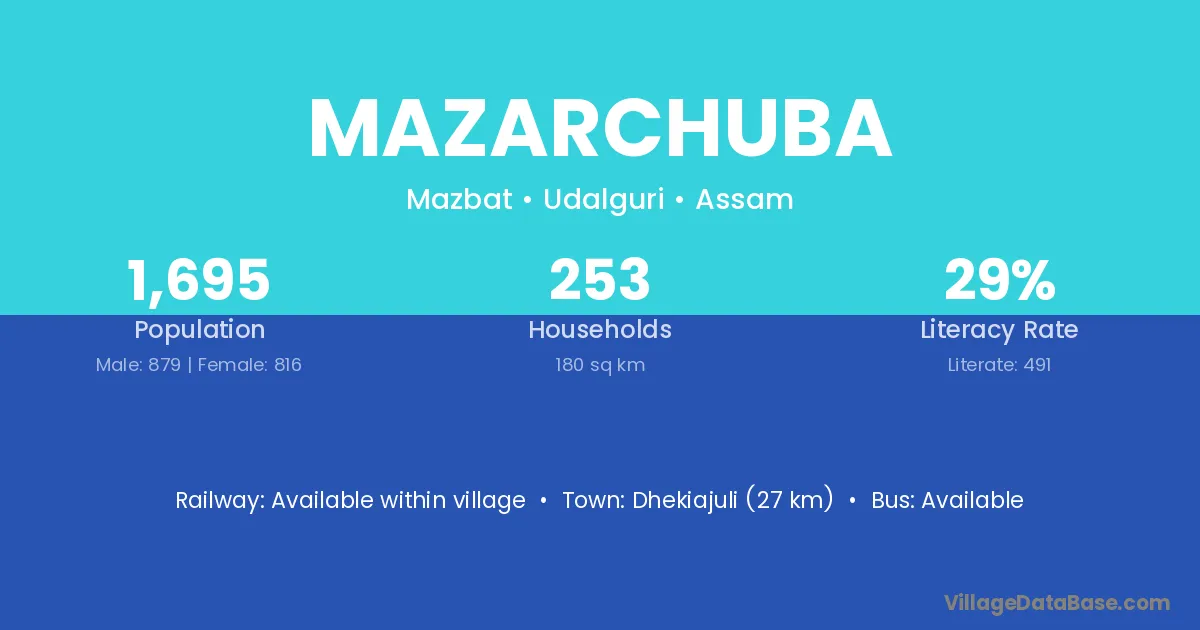 Dhekiajuli (27 km) is the nearest town to Mazarchuba village for major economic activities and is located approximately 27 km away.