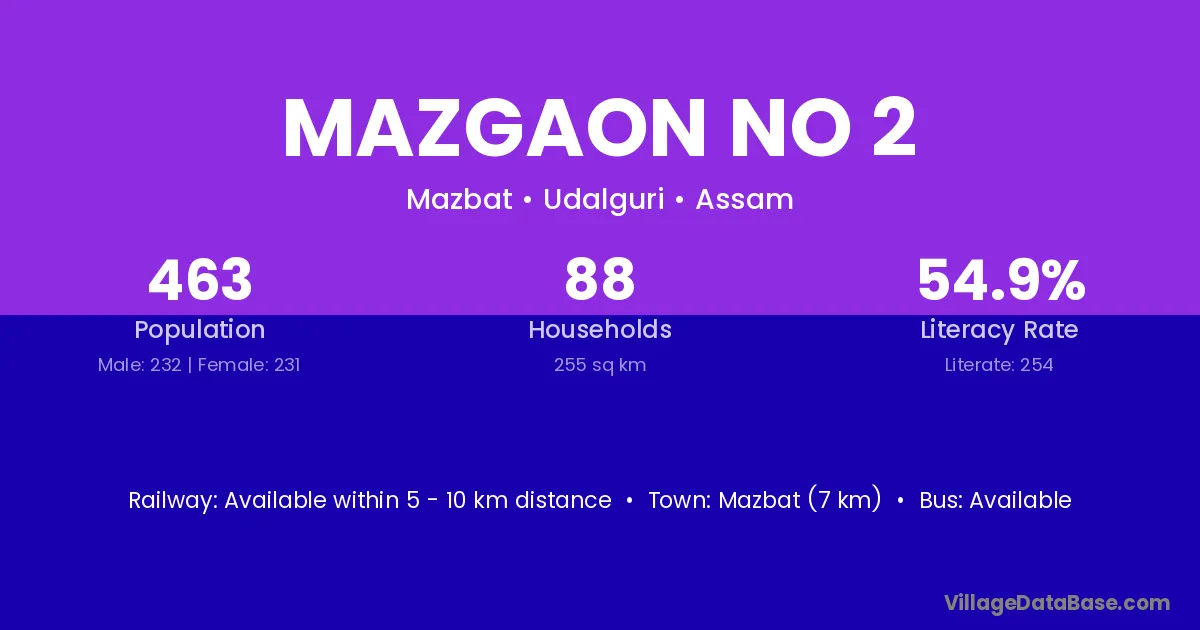 Mazgaon No 2 village has a total population of 463 people, of which 232 are males and 231 are females.