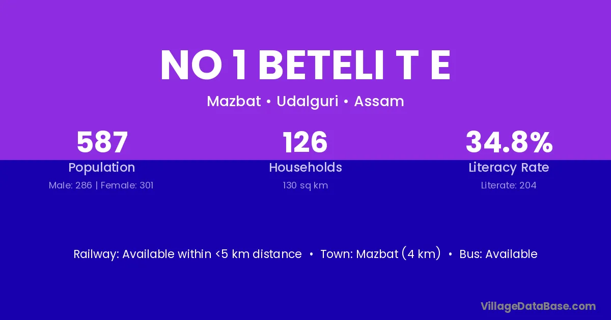 No 1 Beteli T E village has a total population of 587 people, of which 286 are males and 301 are females.
