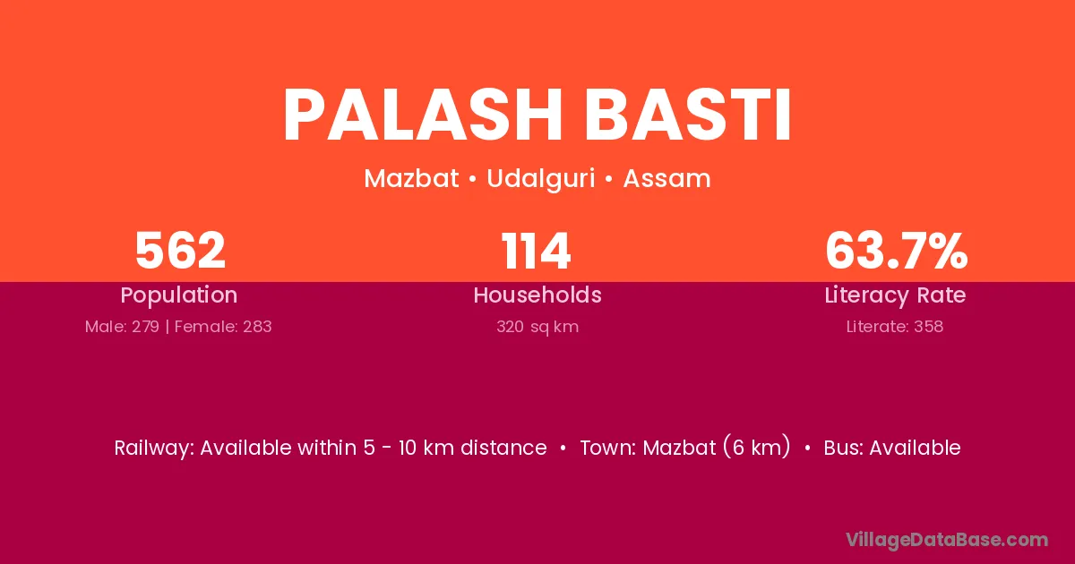 Mazbat (6 km) is the nearest town to Palash Basti village for major economic activities and is located approximately 6 km away.