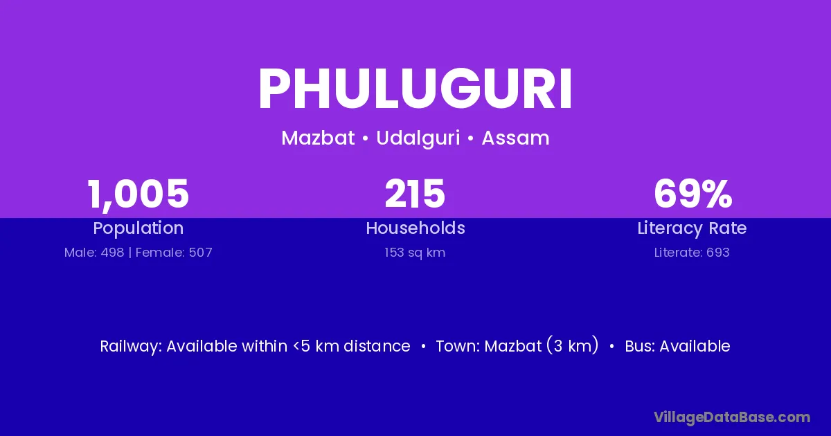 Mazbat (3 km) is the nearest town to Phuluguri village for major economic activities and is located approximately 3 km away.